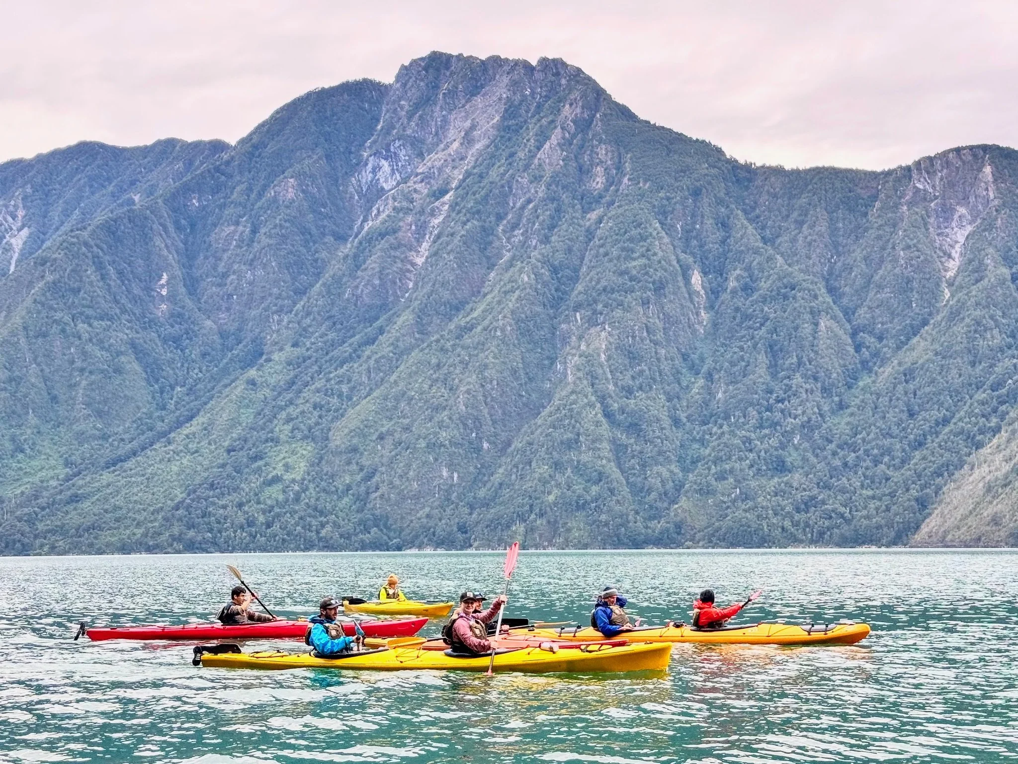 Two people kayaking in a yellow kayak on a calm fjord surrounded by mountainous landscape bosque andino community.