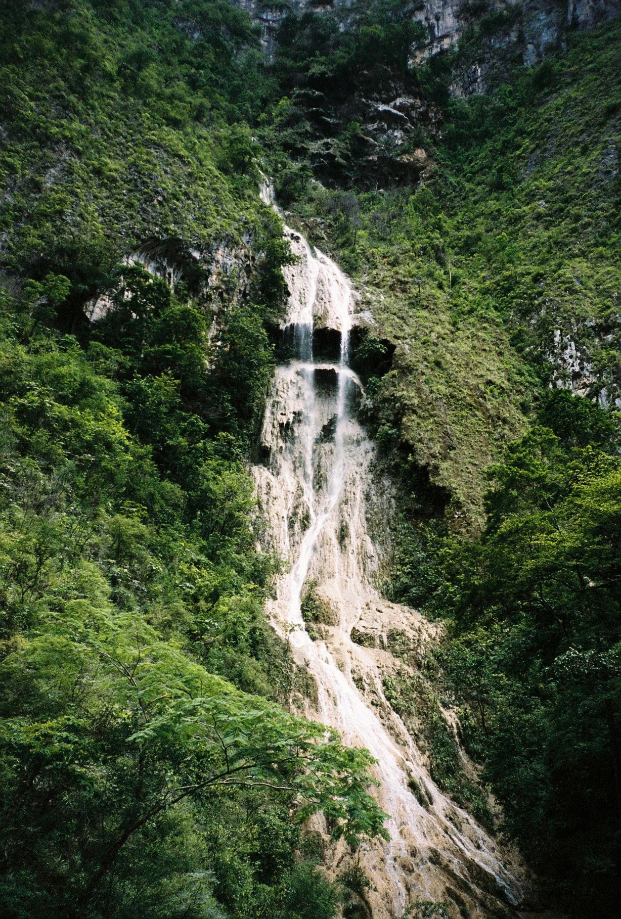 Waterfall cascading down a lush, green mountainside with dense vegetation.